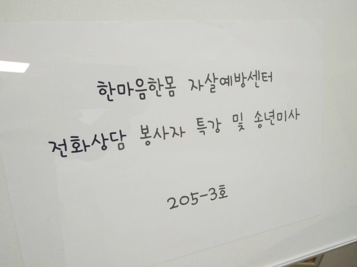 한마음한몸자살예방센터에서는 봉사활동의 의미와 동기를 높일 수 있도록 2017년 전화상담 봉사자 특강 및 송년미사를 11/21(화), 서울 명동 가톨릭회관에서 진행하였습니다. 양진홍 신부님(과테말라외방선교회)의 특강을 통해 한 해를 돌아보며 하느님을 만나고 새로운 다짐으로 새해를 맞이할 수 있도록 20여명의 전화상담봉사자들이 화합의 시간을 가졌습니다. 특강에 이어 송년미사에는 한마음한몸운동본부 본부장 최형규 신부님, 부본부장 이정민 신부님이 함께 해 주셨습니다.