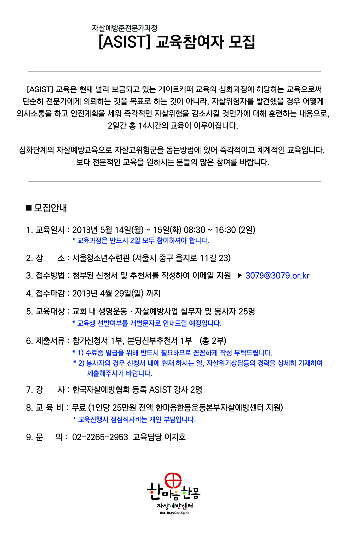 [모집마감] 2018 자살예방준전문가과정 [ASIST] 교육생 모집