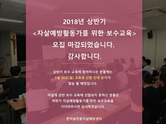 교육생분들의 성원에 힘입어 상반기 [자살예방활동가를 위한 보수교육] 모집은 조기마감되었습니다.