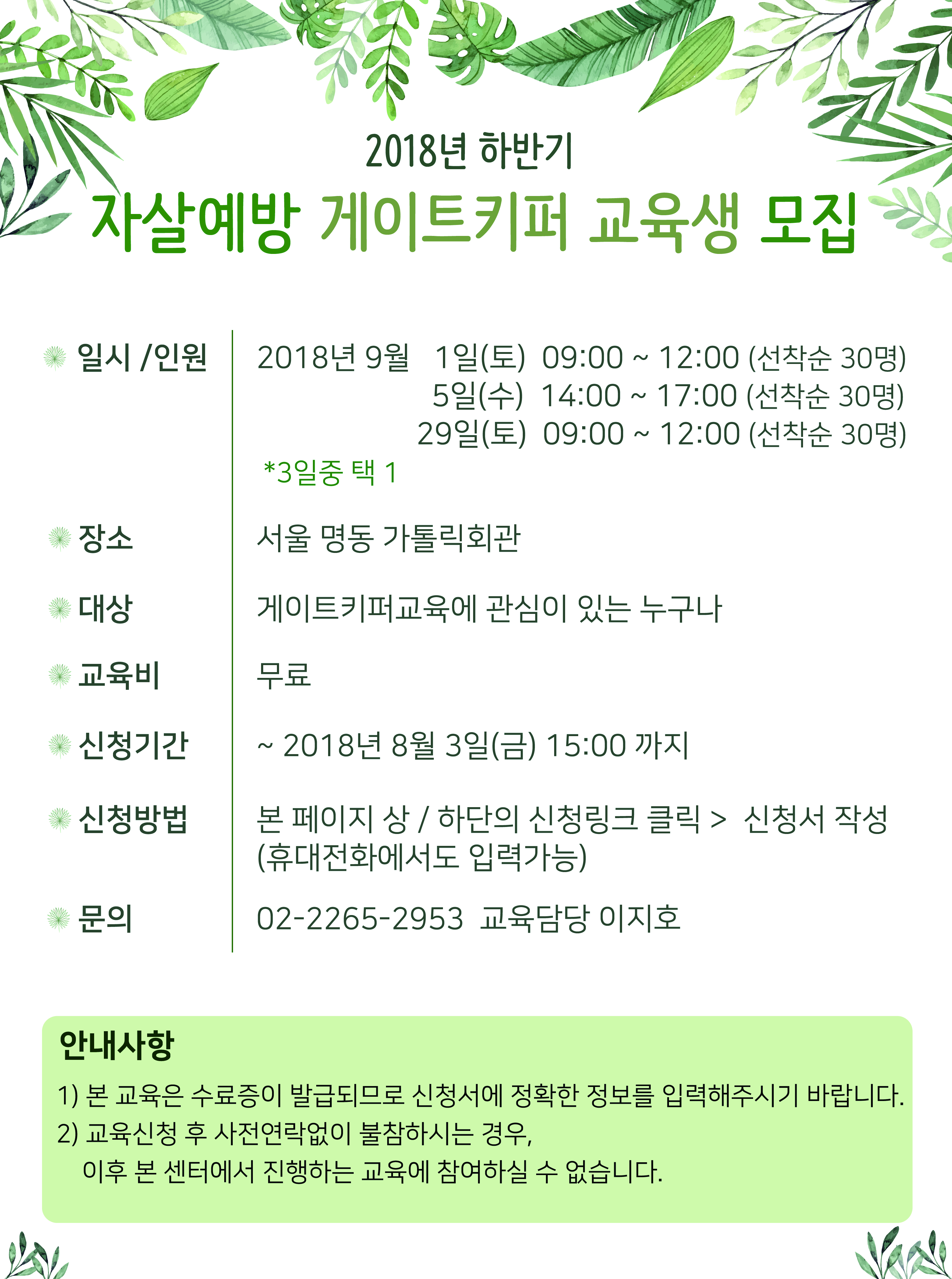 [모집마감] 2018년 하반기 자살예방게이트키퍼 교육 실시 안내