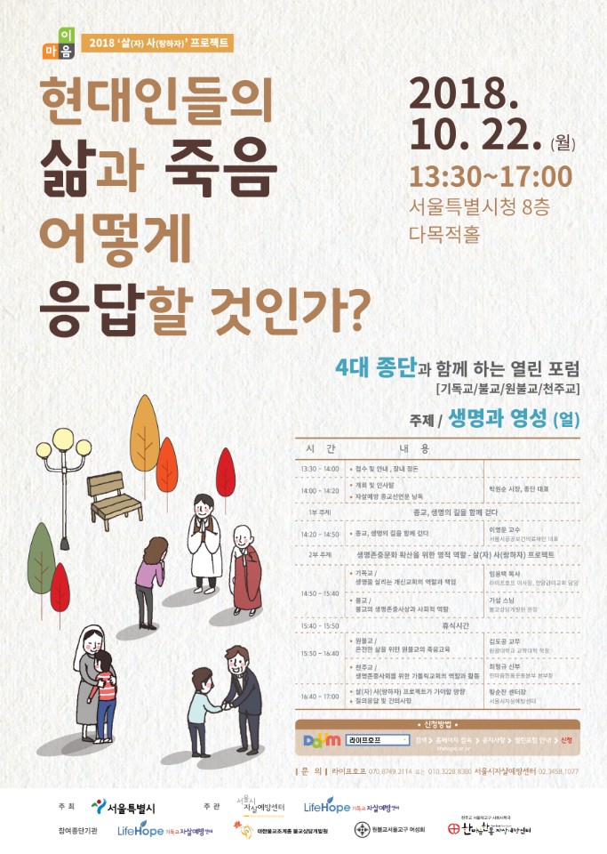 천주교 한마음한몸자살예방센터, LifeHope기독교자살예방센터, 불교상담개발원, 원불교서울교구 여성회, 이제 4대 종단이 함께 모여 현대인의 삶과 죽음을 고민합니다.